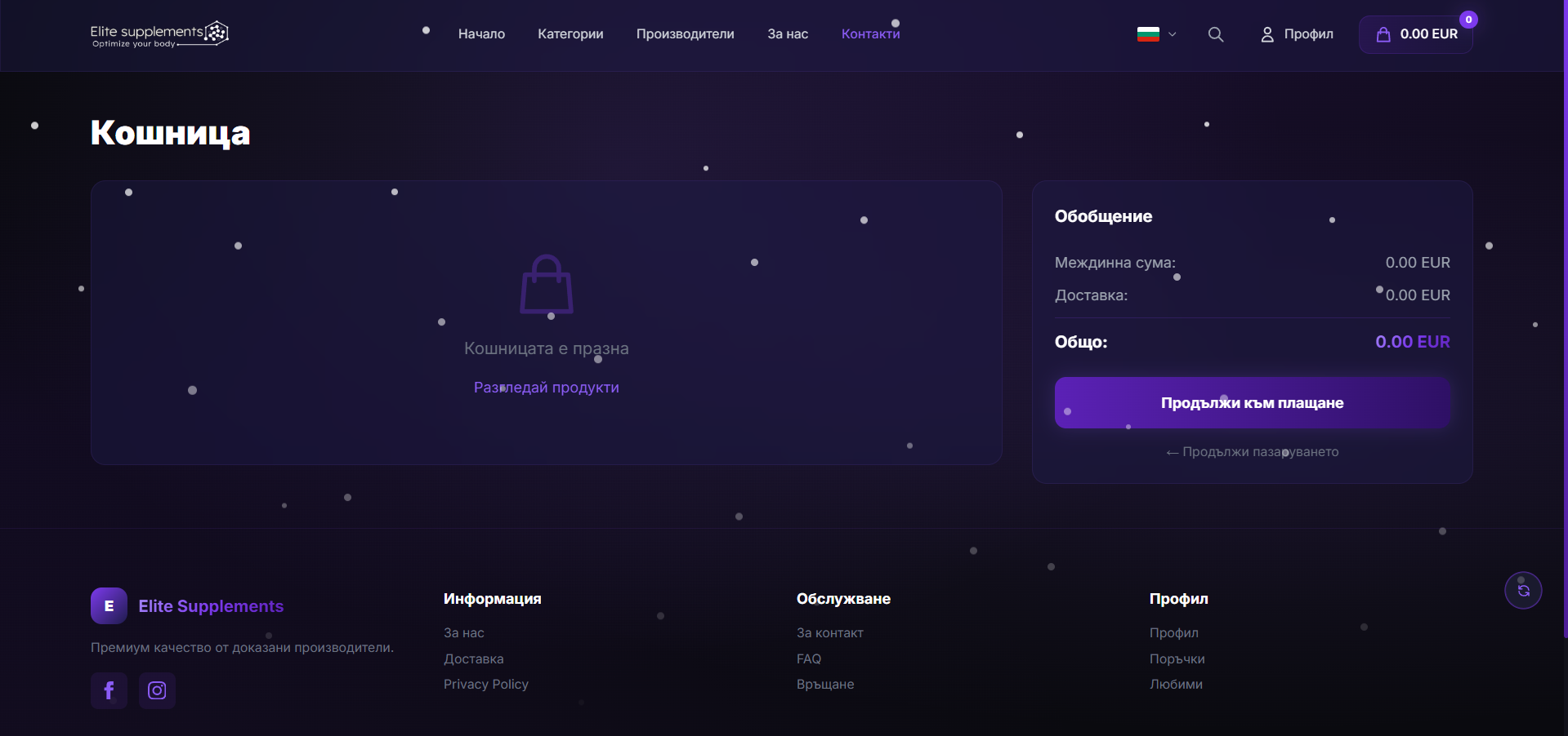 Мулти езичност на Български и Английски език. Онлайн магазин за хранителни добавки и спортна нутриция с модерен e-commerce интерфейс. E-commerce функционалности: пълна кошница, форма за логин/регистрация, бутон „Checkout".