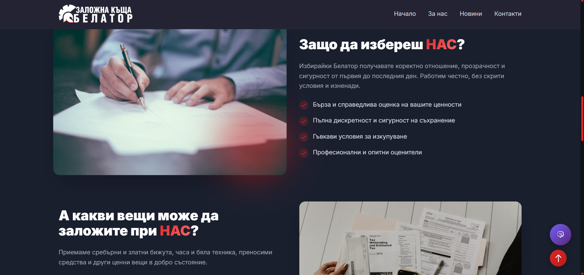 Избирайки Белатор получавате коректно отношение, прозрачност и сигурност. Минималистичен визуален стил с балансирани цветове. Светъл основен фон, комбиниран с контрастни елементи. Заоблени card елементи с меки сенки.